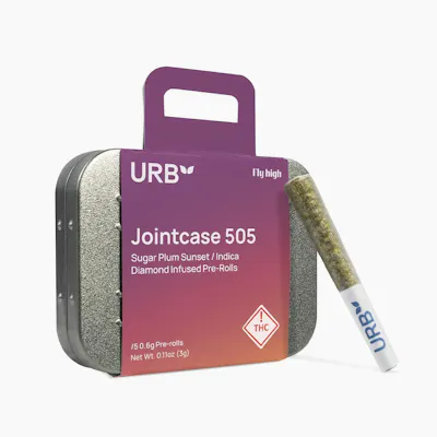 Sugar Plum Sunset - Rich, smooth, and indulgently sweet, this preroll is crafted to elevate both flavor and effect. Each Jointcase 505 preroll is packed exclusively with premium whole flower and infused with triple-milled THC diamonds, delivering powerful potency and an even, consistent burn. Enhanced with high quality terpenes, it offers notes of ripe plum, sweet berry, and a hint of spice—creating a flavor experience as vibrant as its name. This 3g preroll 5 pack is made with whole cannabis flower and infused with triple-milled THC diamonds for consistent potency. Formulated with high quality and flavorful terpenes for amazing flavor and aroma. Contains only whole flower (no trim or shake) Infused with refined THC diamonds for uniform distribution. Enhanced with quality terpenes for maximum flavor expression. Designed for consistent burn and reliable effect. For use by adults 21+. Keep out of reach of children. This product contains cannabis and THC.