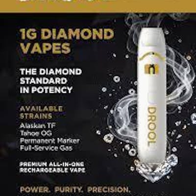 The Drool Full Service Gas Diamond Vape is a high-potency, 1g disposable cannabis device known for its energizing effects and distinct fuel-like aroma. It uses "liquid diamonds," a solventless concentrate made from nearly pure THCA crystals. Product Highlights Strain Type: Typically classified as a Hybrid or Sativa-dominant strain. Potency: This product is very high in THC, with lab results often showing around 90.90% THC. Flavor Profile: It features a bold diesel and gassy aroma with earthy undertones, often compared to the classic Sour Diesel lineage. Effects: Users generally report an uplifting, euphoric, and energizing high, making it a popular choice for creative projects or daytime use.