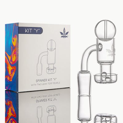 This aLeaf Quartz Banger Spinner Kit "Y" includes a marble style carb cap, two terp pearls, and a 14mm quartz terp slurper style banger. Enhance every dab session with this comprehensive kit featuring the rapid, contained vaporization of the terp slurper design combined with the airflow restriction of the carb cap and the two terp beads that also assist in breaking up concentrates. Available with a 90 degree joint angle. Banger chamber dimensions: 21mm outer diameter, 18mm inner diameter, 52mm height, 28mm lower tray diameter Carb Cap dimensions: ~23mm diameter Terp Beads: 6mm diameter
