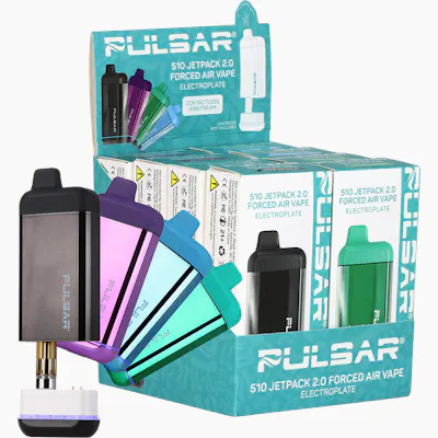 510 Jetpack 2.0 forced air vape bar 650mAh battery capacity Electroplated metallic exterior finish Variable voltage settings (1.8-3.8V) Forced airflow or manual activation Concealed cartridge Fits most cartridges (up to 2mL / 2 grams) Single-button operation Discreet size Universal 510 threading Includes USB-C charge cable **Cartridges sold separately** Available individually or as an 8-count assorted display Multiple color options available Get ready to take your airflow control into the future with the Pulsar 510 Jetpack 2.0 Variable Voltage Vape Bar! This innovative vape has an electroplated metallic exterior finish and allows for optional contact-free use, with forced airflow that automatically channels air through the cartridge at the press of a button. Choose between 5 preset voltage settings to enjoy rich flavor profiles or huge, puffy clouds. The Jetpack 2.0 has a discreet shape to look like a modern disposable vape bar, and with the housing concealing the vape cartridge, users can enjoy their concentrates privately with universal 510 threading and space for cartridges up to 2mL/2 grams in size. Single-button operation allows users to toggle easily between the voltage settings and the Session Modes. Charge up quickly with the included USB-C charge cable. Multiple color options available. Sold individually as an 8-count assorted display.