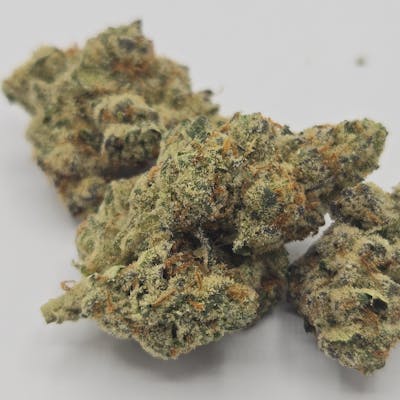 The cannabis strain "Brain Salad" is a cross between Headband, Triangle Kush, and SFV OG Kush. Brain Salad has an aroma of tangerines with a slight touch of diesel and a taste of citrusy pine with a sweet diesel aftertaste upon exhale. Brain Salad buds have small dark army green nugs with olive green leaves, reddish brown hairs, and a fine layer of white trichomes and resin.