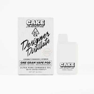 Introducing Designer Distillate by CAKE She Hits Different. Embark on an interstellar journey with our game-changing 1.25 gram all-in-one cosmic vape pod. 90%+ THC potency. Fits in the palm of your hand. Three designer colors. Transcend boundaries and experience the outer realms of style and potency. Cosmic Cookies [ Hybrid ] A CAKE Team favorite. Celestial hints of sugar, starry sprinkles of earth, and a nebula of fragrant undertones. Undeniably irresistible.