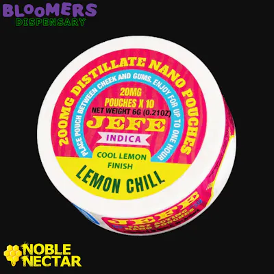 JEFE Nano Distillate Pouches, Lemon Chill flavor, deliver 200MG per pack with 10 pouches, 20MG each, offering relaxing indica effects, fast onset, discreet use, smooth citrus taste, and consistent potency throughout.