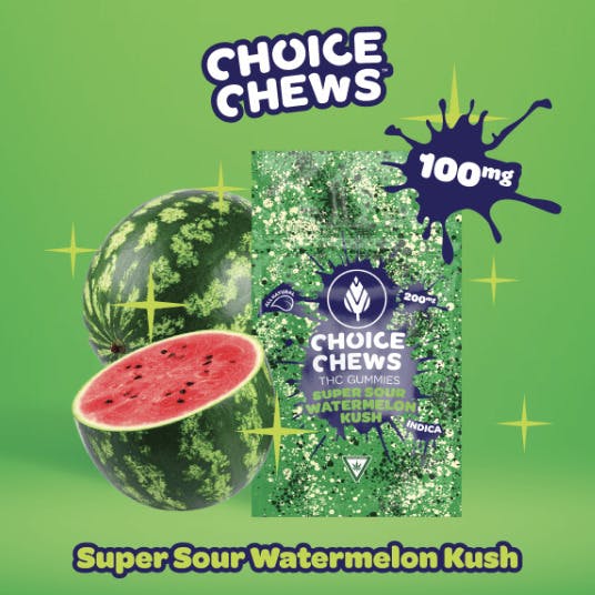 Choice Chews | 100mg THC Gummies | Super Sour Watermelon Kush (Indica)