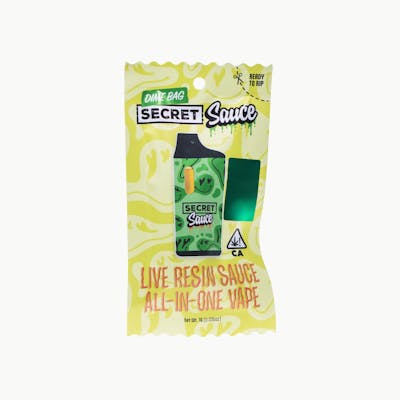 We've been working hard in the lab to cook up something special: introducing Secret Sauce from Dime Bag. Our new Live Resin all-in-one vapes are packed with bold flavor, full spectrum live resin, and designed to provide cloud worthy hits, all at a price that your wallet will appreciate.