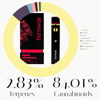The terpene profile for Alpine Strawberry is meant for focus, fun and cheeriness. Highly concentrated in the terpene limonene (yellow), this vape is sure to add some pep to the day, while a dash of linalool (purple) can help curb anxiety.
