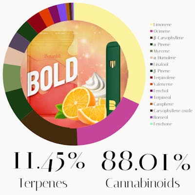 The terpene profile of this Orange Cream is a bright experience for uplifting and euphoric mental "lift." Limonene, the most abundant terpene, drives this mood-boosting clarity and helps alleviate stress. Ocimene follows with its sweet, herbal profile, contributing an energizing, cerebral buzz that's perfect for creative tasks. Caryophyllene adds a peppery kick and provides anti-inflammatory support to ease physical tension without heavy sedation. Pinene sharpens focus and helps keep the mind alert. Myrcene offers a gentle, calming undertone to keep the energy grounded. Finally, Humulene provides a subtle, earthy finish that helps curb appetite and promote physical comfort.