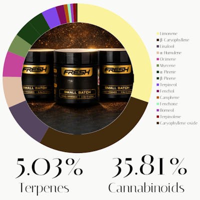 This Gelato Cake presents a profile that expertly balances cerebral stimulation with deep physical relaxation. Limonene leads the charge, offering an immediate mood-elevating "spark" that keeps the experience social and bright. This is grounded by Beta-Caryophyllene, which targets physical tension and provides a soothing, anti-inflammatory body high. Linalool adds a layer of serene calmness, perfect for melting away stress. Alpha-Humulene works to suppress appetite and further reduce inflammation. Ocimene contributes a subtle energetic clarity. Myrcene rounds out the experience by enhancing the strain’s overall sedative properties, resulting in a deeply restorative and blissful state.