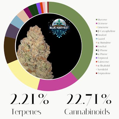 This Grimace terpene profile may offer a deeply relaxing and calming experience due to its terpene profile. The most abundant terpene, Myrcene, is known for its sedative and muscle-relaxant properties, setting the stage for a soothing body high. Next, Ocimene provides a brighter counterpoint, possibly lending an uplifting or energetic boost to prevent heavy sedation. Limonene contributes further to mood elevation and stress relief, creating a sense of well-being. Following this, beta-Caryophyllene may offer anti-inflammatory and pain-relieving effects, which often complements deep relaxation. The fifth terpene, Linalool, enhances the calming effects, potentially reducing anxiety. Finally, Guaiol is included, which has been studied for its anti-inflammatory properties, rounding out the profile with potential physical comfort.