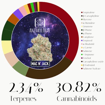 The terpene profile of this Mac N Jack may help promote a stimulating experience, likely leading to an uplifted mood, heightened focus, along with some physical comfort. Terpinolene, the most dominant terpene, typically contributes to energizing and clear-headed effects, promoting mental clarity and a sense of wellbeing. Next, beta-Caryophyllene may introduce notable therapeutic benefits, including potential anti-inflammatory and stress-relieving properties, as it can directly interact with the body’s endocannabinoid system. The presence of Myrcene often assists in muscle relaxation and sedation, suggesting a soothing element that counters the more stimulating effects, contributing to a full-body calm. Humulene is known for its anti-inflammatory and anti-appetite potential, while Limonene is frequently associated with mood elevation and anxiety relief. Finally, Pinene may work to enhance alertness, focus, and memory retention, rounding out the profile with a cerebral boost.