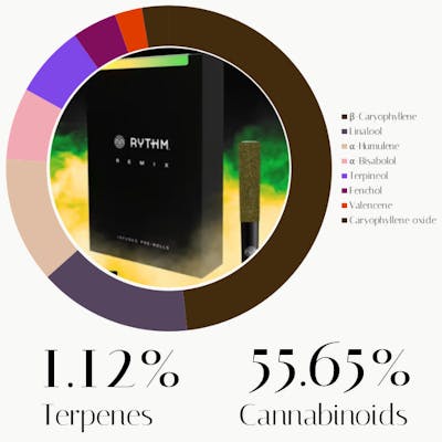 The terpene profile of this Maui Wowie Rythm infused pre-roll offers a calming, tropical experience. Beta-caryophyllene leads the profile, grounding the consumer with stress-relieving and anti-inflammatory benefits that ease the body without causing heaviness. Linalool follows, adding a layer of floral tranquility that melts away anxiety and balances the mood. Humulene further enhances these effects with its own calming, anti-inflammatory properties, while potentially acting as an appetite suppressant. Bisabolol contributes a soothing, chamomile-like gentleness to the session, paired with the sedative and anti-anxiety notes of terpineol that help smooth out the high. Finally, fenchol rounds out the experience with a refreshing hint of pine and lemon, offering antioxidant support and a clean sense of mental clarity.