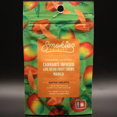 EXTRA-STRENGTH! Smokiez Sweet Mango Fruit Chews are NOT YOUR AVERAGE FRUIT CHEWS™ ;) These delicious fruit chews are a tasty and discreet way for you to medicate! -- They are also Vegan, Gluten Free, Dairy-Free, and contain NO High Fructose Corn Syrup. -- Our mouth-watering fruit chews contain 40 mg of THC (4 servings per piece) and are made with our high-clarity cannabis distillate for great taste. -- There are 10 pieces per package with 400 mg of active THC per package.