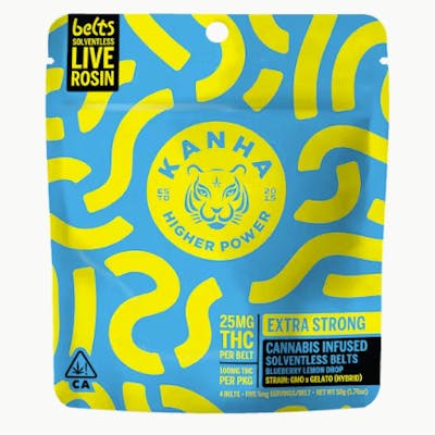 Feel the perfect balance with our Blueberry Lemon Drop Belts, a vibrant Hybrid mix designed for the harmony hunters. Formulated with GMO Cookies and Gelato solventless live rosin for a comforting, mood-boosting journey. Instructions: Eat 1 serving. Onset starts around 5-15 minutes. Wait 60 minutes for full effect. Keep in a cool, dry place. Avoid temperatures over 75°F. Ingredients: Tapioca Syrup, Cane Sugar, Water, Gelatin, Agar, Locust Bean Gum, Citric Acid, Lactic Acid, Natural Flavor, Natural Fruit Concentrate, Natural Color, Carnauba Wax, Solventless Live Rosin Cannabis Oil, Malic Acid, VESIsorb Nanotechnology Servings: 20, Serving Size (2.5g), Amount per serving: Calories 7, Total Fat 0g, Sodium 0mg, Total Carb. 2g, Total Sugars 2g (incl. 2g Added Sugars)