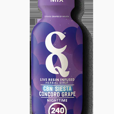 CBN SIESTA CONCORD GRAPE SYRUP WITH LIVE RESIN (STRAIN: GRAPES OF WRATH) NIGHTTIME 200mg THC, 40mg CBN 1 year Shelf Life Makes 20 Drinks. 1 capful = 10mg THC, 2mg CBN. Our calming combination of THC and CBN supports sleep, pain relief, and inflammation. An herbal blend of valerian, lemon balm, and glycine synergistically support rest and relaxation. Ingestible effects lasts longer than smoking to help you all night long. Made with real fruit and sweetened with cane sugar. Sip straight or mix. The dosing window on the side of the bottle allows you to accurately track your consumption. 2 oz travel-size bottle, childproof reclosable cap. VEGAN, NO GLUTEN, NON-GMO. CONSUMPTION ADVICE: Start with 1 capful (10mg THC, 2mg CBN) and wait 45 minutes before drinking more. No refrigeration required. Tastes best cold. INGREDIENTS: Vegetable Glycerine, Cane Sugar, Glycine (1000mg), Water, Cannabis Live Resin Extract, Natural Flavors, Citric Acid, Valerian Root (300mg), Lemon Balm (300mg), Organic Fruit & Vegetable Juice (for color), Potassium Sorbate, Malic Acid, Terpenes, Vitamin C (Ascorbic Acid).