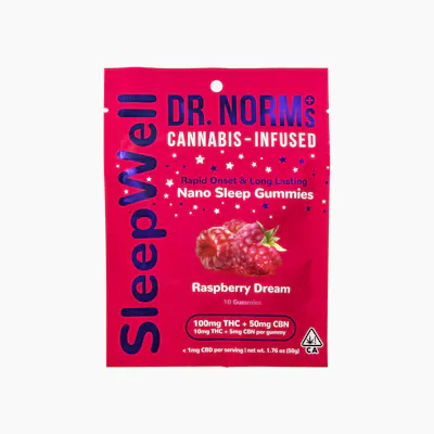 The new Dr. Norm's Raspberry Dream Sleep Gummies contain a combination of cannabinoids specially selected for their effects on long-lasting sleep – a 2:1 ratio of THC and CBN, with a total of 100mgs of standard and nano-emulsified THC and 50mgs of nano-emulsified CBN per bag.