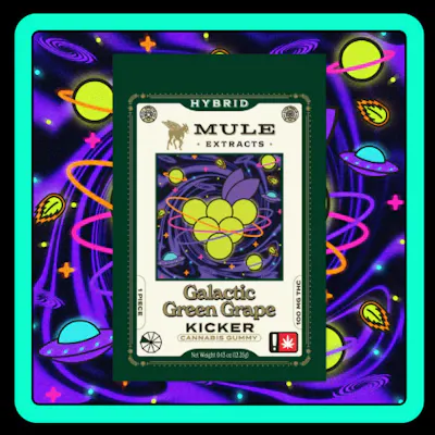 Take a trip to a sweet galaxy far, far away with Mule Extracts Kickers Green Grape Galaxy edibles! INGREDIENTS: Sugar, corn syrup, water, gelato, natural flavoring, coconut oil, pectin, citric acid, malic acid, soy