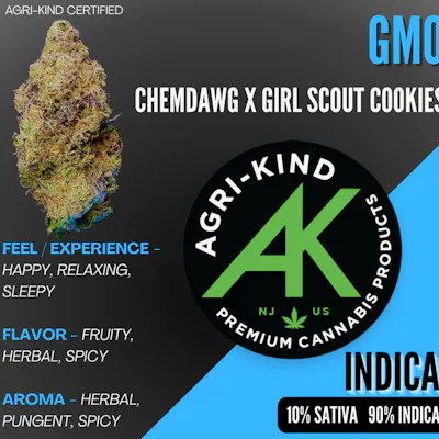GMO by Agri-Kind is a potent indica-dominant hybrid flower known for its heavy, relaxing effects and loud, savory aroma. It typically delivers a strong full-body experience paired with a stony, long-lasting head high, making it best suited for evening or end-of-day use. This cultivar produces dense, dark green buds coated in thick, glistening trichomes with bright orange hairs throughout. The flavor profile leans intensely savory and funky, with notes often described as garlic, diesel, and earthy spice, leaving a pungent, lingering finish on the palate. Many consumers reach for GMO to help with deep relaxation, stress relief, and unwinding when they don’t need to stay productive, due to its high THC potential and strongly sedating nature.