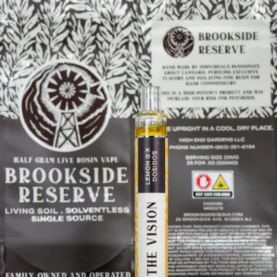 Lemon G X Dosidos The Vision is a hybrid strain. It combines genetics from the classic Ohio Lemon G, famous for her strong lemon peel and Christmas wreath flavor, and the resinous, award-winning Do-Si-Dos. This strain was created as a testament to the vision of a brighter future through the propagation and cultivation of quality cannabis. Cultivated in regenerative living soil and processed entirely in-house by Brookside Reserve, a single-source operation dedicated to solventless extraction. By controlling every step from genetics and cultivation the team preserves the plant’s full terpene expression and natural resin quality.
