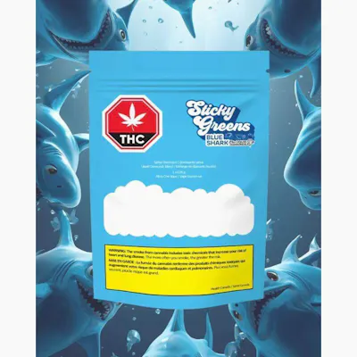 Welcome to Sticky Greens' Blue Shark: the tangy taste of blue raspberry blended with high potency THC distillate, and liquid THC diamonds for an extra bite. Enjoy it now in a slim, discreet, and rechargeable palm-sized disposable vape.