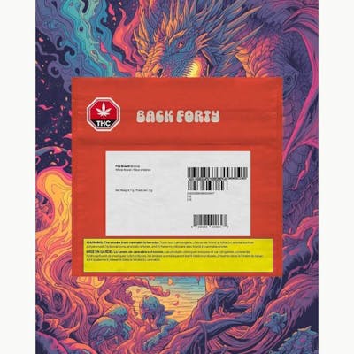 Turn up the heat with Back Forty's legendary cultivar - Fire Breath. A cross between Fire OG and Mendo Breath, this potent Indica produces dense buds loaded with trichomes, offering pungent notes of fresh earth, woody spice, and a hint of diesel. Our Back Forty flower is always hang-dried, dry-trimmed, and includes a humidity pack.