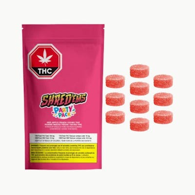This multipack contains 10 immediate containers, each with one soft chew-for a total of 10 soft chews. SHRED'ems Red Apple Peach Party Pack has 10 packs of MAX10 gummies, each with 10mg THC for a total 100MG THC PER PACK! These juicy indica gummies blend the crisp sweetness of red apple with the smooth, mellow flavour of ripe juicy peach.
