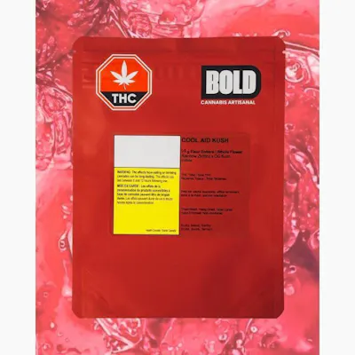 Cool Aid Kush is a heavy-hitting indica dominant strain that brings together the classic kush character of OG Kush and a citrus twist from Rainbow Zkittlez. Expect earth and diesel-forward aromas balanced by subtle notes of lemon, for a blissful experience. The buds are large and frosty, showcasing dark green hues and deep orange pistils. BOLD Craft Cannabis is indoor grown, small batch, hang dried, slow cured and hand trimmed.