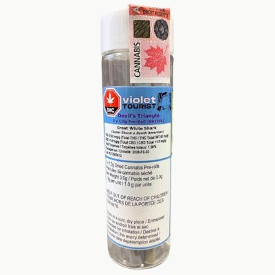 Set sail on a thrilling voyage with Violet Tourist's Devil's Triangle - where mysteries meet mastery. This daring pack charts 3 x 1.0g PreRoll Joints (PRJs), boldly rolled for sativa sailors chasing the horizon's edge. Grown in a state-of-the-art indoor facility in Alberta, Canada, Devil's Triangle surges with invigorating flavors: sharp sea salt tang, crisp tropical breezes, and a hazy herbal mist that evokes endless waves. Each 1.0g pre-roll is masterfully twisted with organic hemp papers and finely ground flower for a robust, steady burn and exhilarating, ocean-fresh draw.
