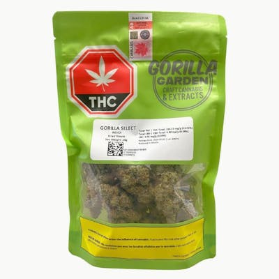 Gorilla Select 28g Flower is a rotating strain SKU that showcases the best of what our cultivation team has to offer-always potent, always premium, and always gorilla-strong. Each batch is carefully selected to deliver top-tier quality, featuring dense, trichome-rich buds and a terpene profile that hits hard and lingers long. Expect a powerful aroma that varies by batch but consistently leans into pungent, earthy, and fuel-forward notes with hints of sweetness or spice depending on the cultivar. The flavour is bold and full-bodied, offering a smoke that's smooth yet intense-perfect for those who appreciate a strain with serious character. This 28g format is ideal for consumers who prefer to roll their own, vaporize, or experiment with infusions. Whether you're stocking up or sharing with friends, Gorilla Select delivers value without compromising on quality. Effects range from deeply relaxing to creatively energizing, depending on the rotating strain, but every pouch is designed to satisfy users looking for a reliable, high-impact experience. Packaged in a resealable pouch to preserve freshness and potency, Gorilla Select is your go-to for variety, strength, and consistency. No matter which strain is featured, you can count on a gorilla-grade experience every time. Rotating strains. Consistent power. Always premium. Step into the wild with Gorilla Select.