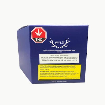 This multipack contains 10 immediate containers, each with one soft chew-for a total of 10 soft chews. Wyld Elderberry Indica Enhanced THC:CBN gummies are a 2:1 product featuring a balanced dose of CBN. Made sustainably using real fruit, botanical terpenes and natural flavours. Each gummy contains 10mg THC and 5mg CBN for a total of 100mg THC and 50mg CBN per pack. All Wyld gummies are packaged in a fully compostable pouch, and our recipes are formulated by food scientists to provide consistent experiences that taste amazing. Wyld gummies use sunflower lecithin to improve bioavailability and onset time and are made to be thermostable up to 55 degrees celsius, with a firm texture that doesn't stick to your teeth. Each Wyld Elderberry Indica Enhanced gummy contains 10mg THC and 5mg CBN combined with the terpenes myrcene, linalool, beta-caryophyllene, and terpineol for a relaxed, restful experience.