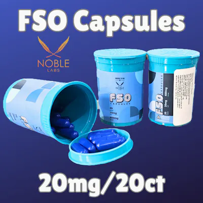 Noble Labs FSO Capsules | 20mg 20ct THC: 435mg per package / 20mg per dose. ... Ingredients: Coconut Oil, Gelatin, & Cannabis Extract Nutrition facts per 14g | Total fat: 14g