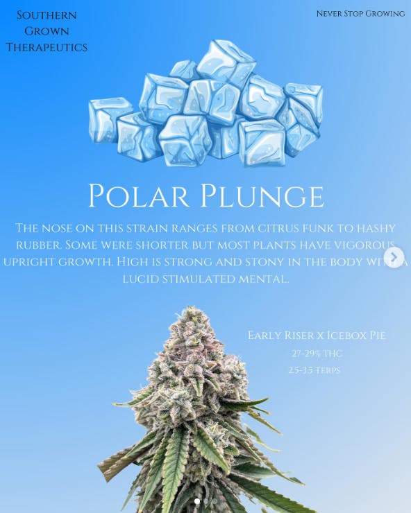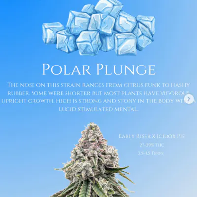 Polar Plunge ❄️ this Strain is Ideal for those looking for a refreshing and balanced experience. Patients report relief from depression, nausea, stress, mood swings, chronic fatigue, and pain relief.