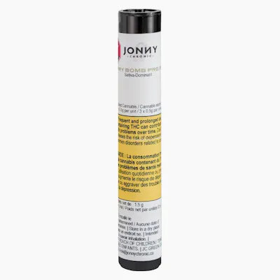 Jonny Chronic Cherry Bomb Pre-Rolls contain a high-THC, sativa dominant strain that produces dense, light green buds with golden-orange pistils and a thick frosting of trichomes. Made with a single strain, Cherry Bomb delivers an earthy aroma of sweet flowers derived from caryophyllene, pinene, and limonene.