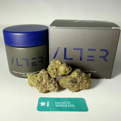 Galactic Warheads is a bold indica known for its flavor and powerful character, delivering a striking mix of sweet and tart candy notes with a strong, spacey effect. Its terpene profile opens with bright sour citrus, layered fruity sweetness, and tropical tones, finished by a light creamy gas that adds depth and balance. The effects begin with an uplifting cerebral rush that can elevate mood and spark a creative mindset before gradually easing into a calm, full body relaxation that stays smooth without becoming too heavy. It’s a strong choice for anyone who enjoys flavorful strains, social sessions, or a potent smoke with a playful edge.