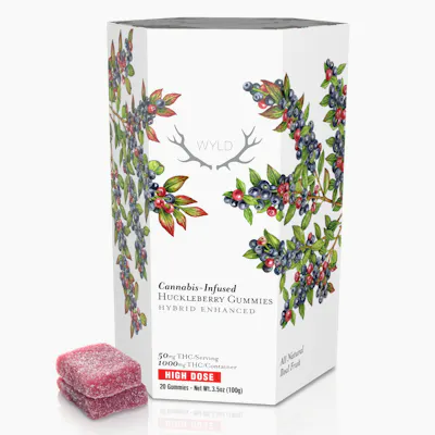 Wyld Huckleberry Hybrid gummies are made with real fruit and enhanced with a balanced hybrid terpene profile that assists in creating a sense of cheerfulness and overall well-being. Ideal for your day-to-day adventures! Terpenes: Limonene Linalool Alpha-Pinene Beta-Pinene 1000mg THC per pkg 50mg THC per gummy / 20 Gummies per pkg