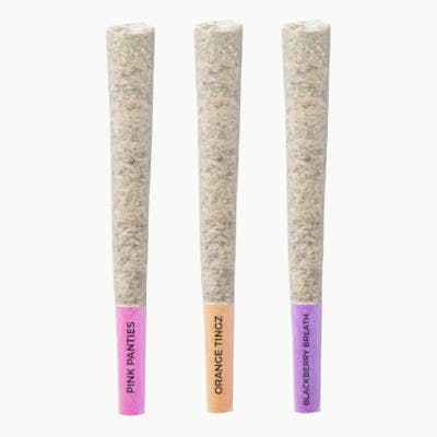 Pink Panties is an indica-dominant hybrid which is a cross of Burmese Kush and Florida Kush. This strain is rolled with whole flowers with pale orange and shocking pink pistils, with a covering of trichomes that appear pink in the right light. Dominant terpenes include Caryophyllene, Farnesene, and Linalool.