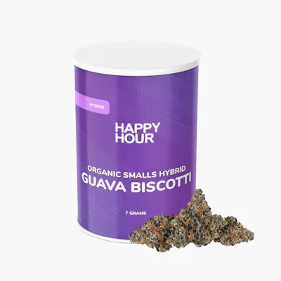 Happy Hour Organic Smalls bring craft-grown quality and certified organic integrity to an accessible 7g format. Grown by Coast Mountain Cannabis in Pemberton Valley, these buds are hang-dried, slow-cured, and hand-trimmed, preserving their full terpene expression and natural character. Certified organic by Pro-Cert, this flower represents the highest standards of cultivation - free from synthetic fertilizers and pesticides - while offering award-winning craft cannabis at a price point that makes organic accessible to all. Guava Biscotti is a potent hybrid strain with an indica-leaning personality, bred from a unique backcross of Guava Biscotti x Guava Biscotti. This strain offers a rich, dessert-inspired flavour profile – think creamy biscotti accented by bold earthy, peppery, and woody notes – making each inhale smooth and satisfying. Happy Hour Organic Smalls 7g delivers clean, sustainable cannabis without compromise.