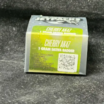 Jetpacks Cherry AK47 Badder – 1 g is a potent cannabis concentrate this badder-style extract features a smooth, whipped consistency that makes it easy to dab or add to flower for enhanced potency and terpene flavor. Badder concentrates are known for their rich cannabinoid content and flavorful terpene profile, delivering strong and fast-acting effects. Cherry AK47 is a sativa-dominant hybrid and a phenotype of the classic AK-47 strain, recognized for its energizing cerebral effects and distinctive cherry-forward aroma. The strain often produces uplifting, euphoric sensations with creative and mood-boosting qualities, making it a popular choice for daytime sessions. The flavor and aroma profile typically features sweet cherry, berry, citrus, and earthy skunk notes, with subtle hints of mint and spice that create a complex and flavorful experience.