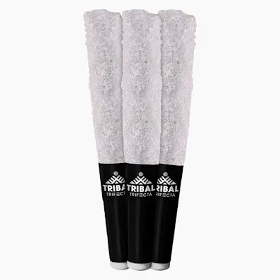 Tribal Trifecta. No fake terpenes and no distillate. Tribal Trifecta Bubble Up infused pre-rolls are made of triple infused Bubble Up flower with matching liquid diamonds, terpene sauce and dusted with THC-A diamonds. Rolled and finished with a ceramic tip. Liquid diamonds + terpene sauce + THC-A diamonds = the Tribal Trifecta.