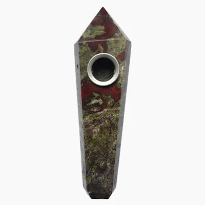 A legend says the stone is the remains of deceased ancient dragons – the green being the skin and the red the blood. Metaphysically, Dragon Blood Jasper is an intensely healing stone, promoting courage, strength, and vitality while also keeping you centred and grounded Made from a real gemstone Approx: 4" long Screen Bowl Pops In/Out For Easy Cleaning and replacement Since all crystals are natural and one of a kind, your piece will vary slightly from the picture shown.