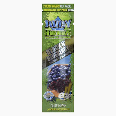 Juicy Hemp Wraps Black N Blueberry Flavour, 2 pure hemp wraps/pack, contains no tobacco, made from natural toasted hemp, resealable pack.