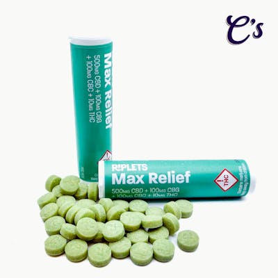 Introducing Riplets — the latest discreet, convenient, and consistent edible from Ripple. Max Relief Riplets offer a non-psychoactive way to ease into any situation. With the anti-inflammatory powerhouse combination of THC, CBD, CBG, and CBC, Max Relief unlocks that zen feeling you’ve been searching for. With 20 pills per portable, recyclable tube, your dose is up to you. Just as with all Ripple products, Riplets are proven fast-acting and highly bioavailable. No need to pour or mix — simply swallow. Fast-acting | Zero sugar | Zero calories | Gluten-free | Vegan Hybrid-Like Effect THC: 10mg CBD: 500mg CBG: 100mg CBC: 100mg 0.5mg THC : 25mg CBD : 5mg CBG : 5mg CBC per pill 20 pills per container