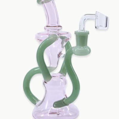 A twisty curvy recycler rig from Plain Jane Glass. With a dual color setup, this recycler will stand out in your collection. Use it with a dry-herb bowl or a Plain Jane quartz banger. It can handle herb and concentrates with ease.