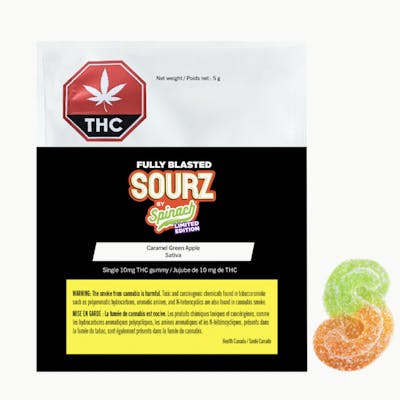 Prepare for blast off! Limited edition SOURZ by Spinach® Fully Blasted Caramel Green Apple gummies are action-packed with 10mg THC per piece. Enjoy buttery, sweet caramel and tart-green apple flavours! This dual-flavoured gummy is over-the-top with natural flavours and blasted with sour crystals. Enjoy 1 gummy per pack, 10mg THC total.