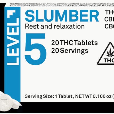 Struggling to find a natural and effective way to unwind and get a good night’s sleep? Then forget sugary gummies and late-night snacks and try LEVEL 5 Slumber. We’ve combined the power of 5 mg of delta-9 THC, 5 mg of CBN, and 3 mg CBG in a carefully balanced formula designed to gently lull you into a state of relaxation and promote restful sleep. These highly effective, long-lasting tablets are sugar-free, gluten- free, vegan, and contain zero calories. They’re scored for easy splitting so you can customize your dose to find the perfect level of tranquility. Simply swallow with liquid.