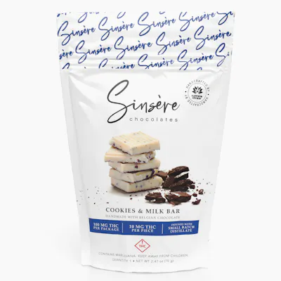 Sinsere Cookies & Milk Chocolate Bar: Decadent and nostalgic, Cookies & Milk Chocolate Bars from Sinsere bring together creamy Belgian white chocolate and crunchy chocolate sandwich cookie pieces for a rich, dessert-inspired edible. This bar delivers a smooth, melt-in-your-mouth texture with bursts of cookie crunch throughout, creating a perfect balance of sweet creaminess and chocolatey depth. Crafted with high-quality ingredients and infused with cannabis oil, each bite offers a consistent and indulgent experience. -10mg THC per piece, 100mg THC per package -Smooth, creamy texture with crunchy cookie bits Company Overview: Sinsere is known for crafting high-quality, approachable cannabis-infused treats that focus on flavor, consistency, and simplicity. With an emphasis on classic dessert profiles and dependable dosing, Sinsere creates products that appeal to both new and experienced consumers looking for a familiar, satisfying edible experience. How Edibles Are Consumed: Cannabis-infused edibles are consumed orally and processed through the digestive system. Effects typically take longer to set in—usually between 30 minutes to 2 hours—but tend to last significantly longer than inhaled cannabis. It’s recommended to start with a low dose and wait before consuming more to ensure a comfortable and controlled experience. Explore more Sinsere edibles available at our recreational dispensary in Grand Junction, CO.
