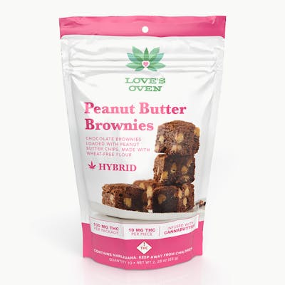 Love’s Oven - Peanut Butter Brownies - Hybrid • Infusion Method: Cannabutter • 100mg Chocolatey wheat-free brownies with peanut butter chips mixed throughout. So delicious you won’t know they are wheat-free! Made with wheat-free flour and infused with 10 mg of natural cannabutter for that classic long-lasting high.