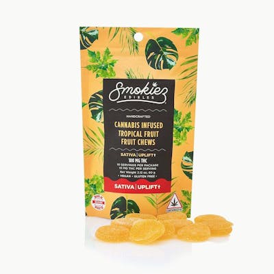 Enhanced with real cannabis terpenes! Smokiez Tropical Fruit Sativa Fruit Chews are NOT YOUR AVERAGE FRUIT CHEWS™ ;) These fruit chews taste like a mesh of fresh tropical fruits, with a balance of sweetness and fruity notes. These delicious fruit chews are a tasty and discreet way for you to medicate! They are also Vegan, Gluten Free, Dairy-Free, and contain NO High Fructose Corn Syrup. Each of our mouth watering fruit chews contain 10 mg of THC, and made with our high clarity cannabis distillate for great taste. There are 10 pieces per package with 100 mg active THC per package.