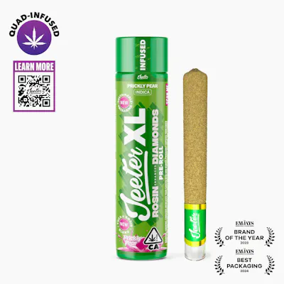 The Jeeter Quad-Infused Pre-Roll redefines infused pre-rolls by combining four premium enhancements for a superior smoking experience.. THCA diamonds provide high potency, rosin introduces a full-spectrum extract for richer depth and complexity, terpenes create a dynamic flavor profile, and kief ensures a smooth, slow burn. This purposeful infusion process delivers a more balanced and flavorful smoke. Alongside its enhanced formulation, Jeeter remains committed to sustainability, with new opaque packaging made from 25% post-consumer recycled plastic, reducing environmental impact without compromising the premium experience.