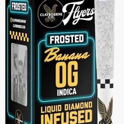 Frost Around & Find Out! These super tasty half gram pre-rolls are Diamond Frosted, Terpene Enhanced, and made from Premium Indoor, Full Nug Flower Infused with Liquid Diamonds. Each Frosted Flyer is highly potent and packed with nonstop flavor all the way down to the crutch. Available In: (1g) 2-Packs & (2.5g) 5-Packs. ______ Let your body peel out with Banana OG. This strain will drive you absolutely bananas with its sweet flavor; and like a banana in the tailpipe, this heavy indica with shut you down. An ideal night strain, Banana OG will get you slipping into a barrel of comfort. Get lit or go split. Flavors Tropical Sweet Earthy