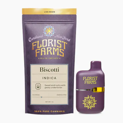 Biscotti | Indica | Pure Live Resin | All-In-One-Vape | 1G About This Product Live Resin is the closest you can get to tasting the plant exactly as it was at the moment of harvest. The flower is frozen fresh to preserve its full terpene and cannabinoid profile, resulting in a more flavorful and full spectrum experience. We love this vape from Florist Farms because it has a ceramic core and burns at just the right temp for a smooth hit every time. Effect: Indica Flavor: Sweet and nutty with gassy undertones Ingredients: 100% Pure Live Resin Why We Love Florist Farms Located in Cortland, NY, Florist Farms is committed to sustainability. They practice regenerative farming by growing in living soil, using organic compost, and never using pesticides. For over a decade, they have been organic vegetable farmers and donate produce weekly to help support their community. Our friends at Florist Farms are deeply committed to quality and to delivering the cleanest cannabis products in New York State.
